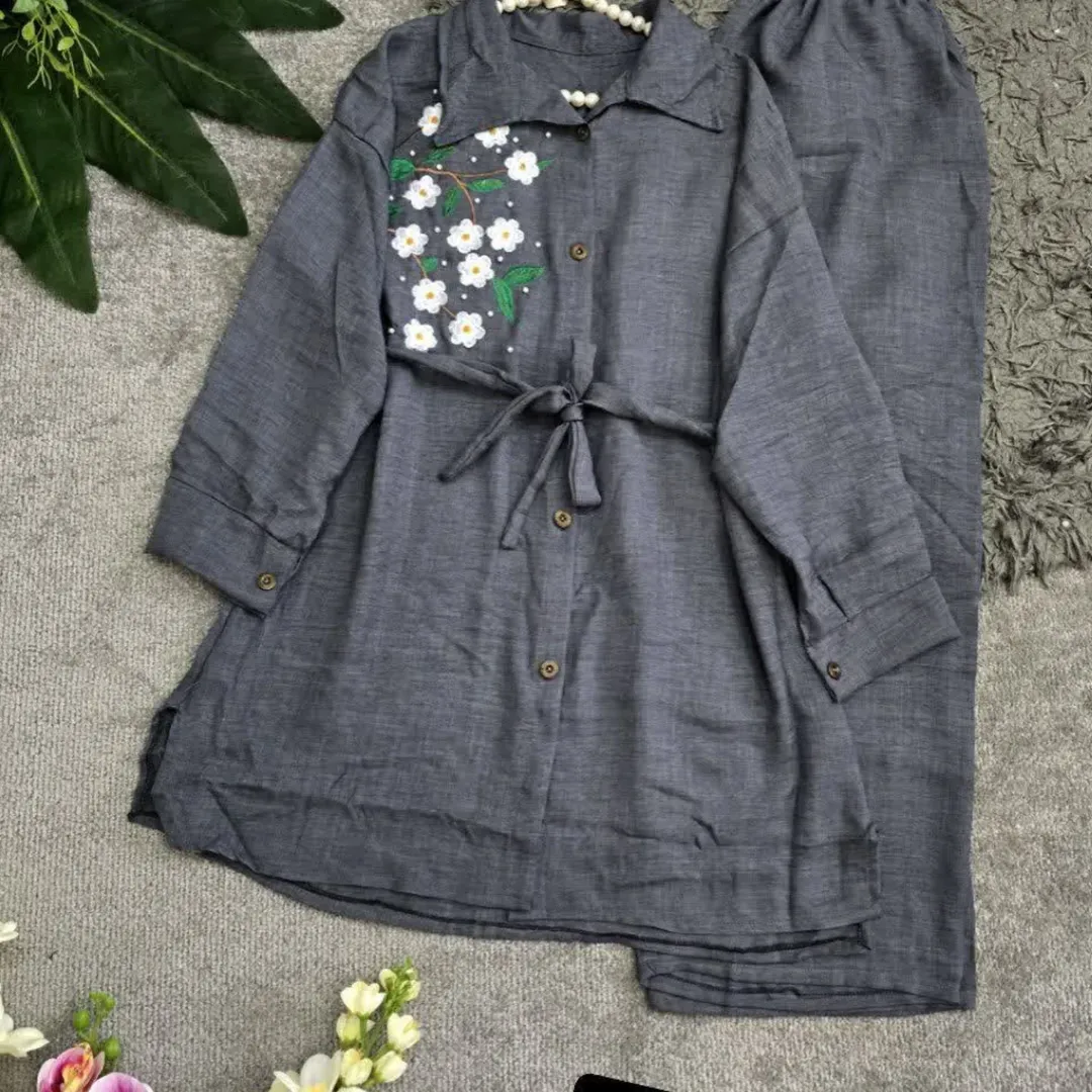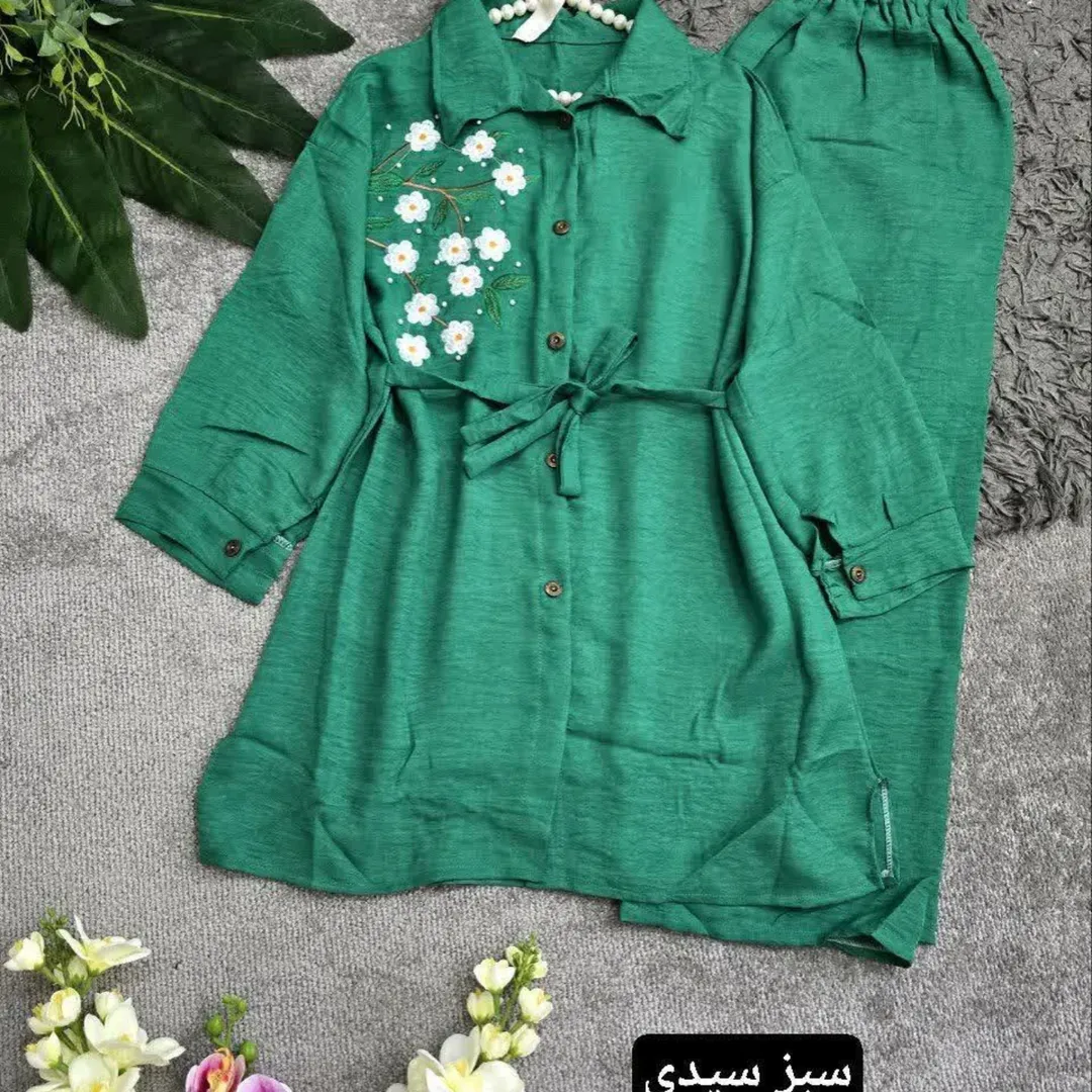 ست شومیز مانتویی و شلوار گل ریز جنس شانتون